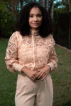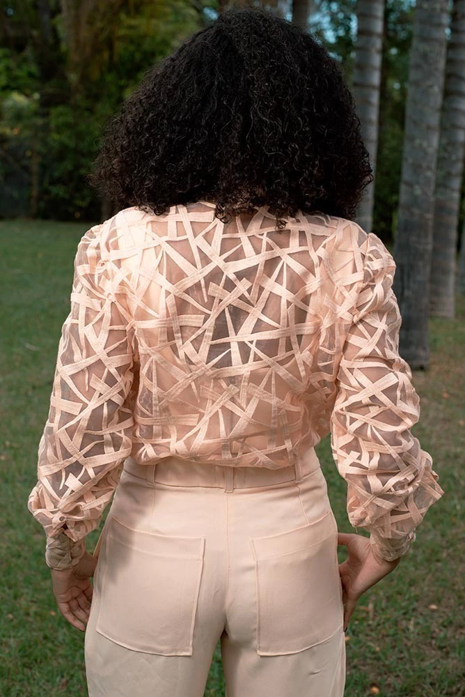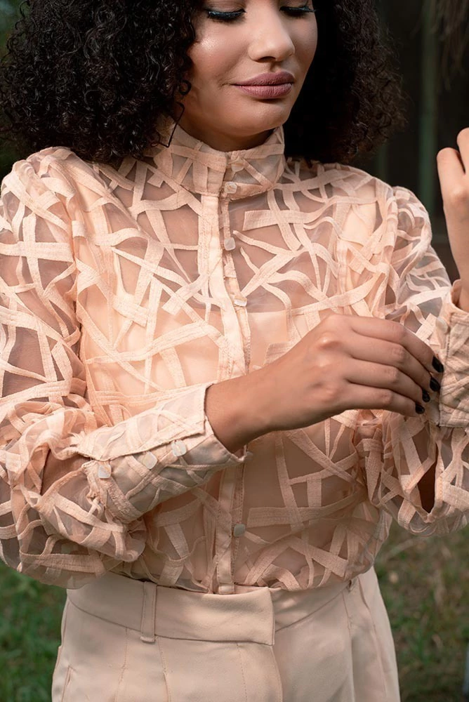 Camisa, confeccionada em tecido bordado de algodão, com gola média, punho largo, abotoamento por casas e botões trabalhados, mangas levemente bufantes.