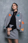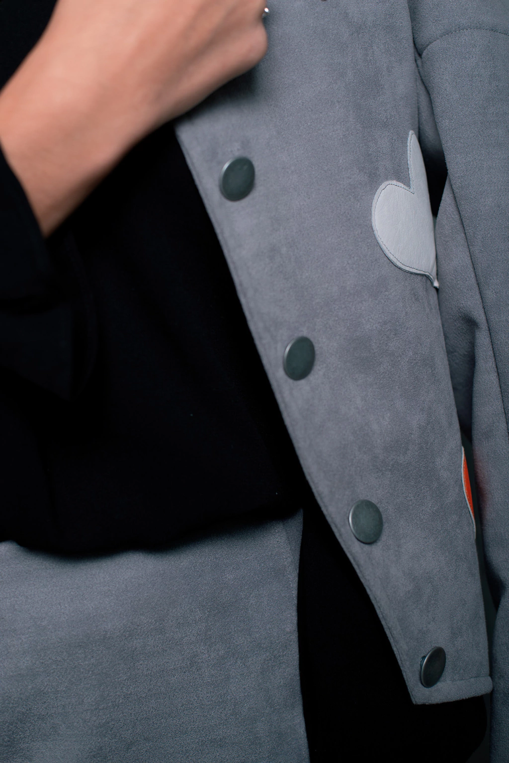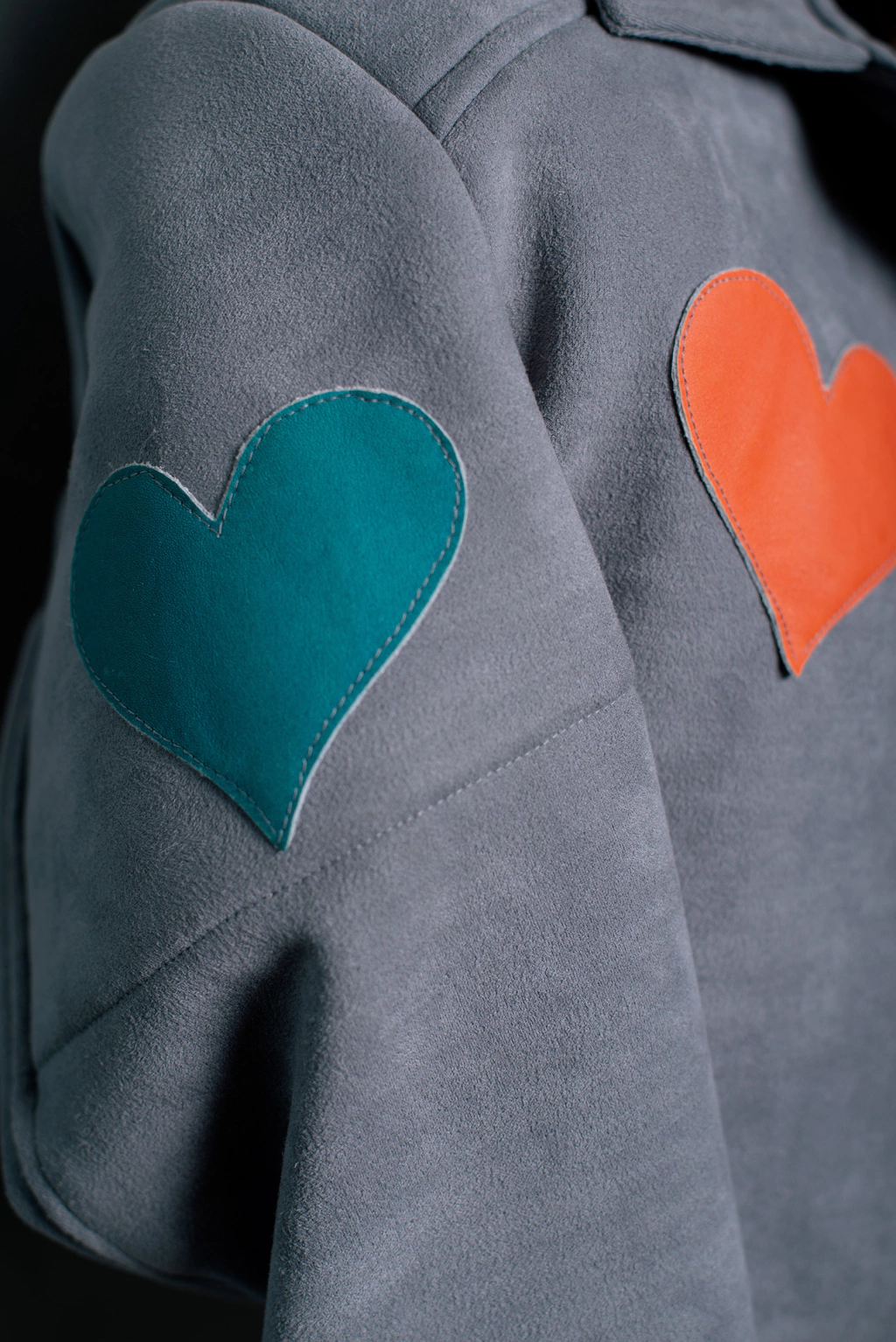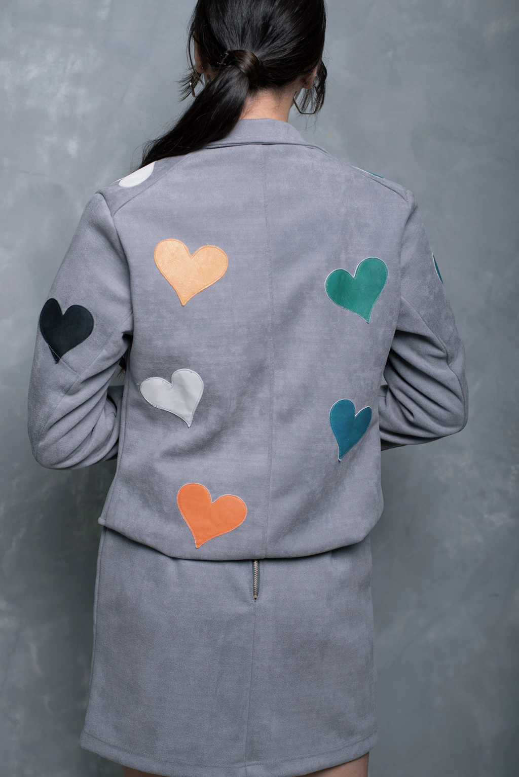 Jaqueta Manu, confeccionada em tecido encorpado e acamurçado. Com aplicações "paches" em couro original, nas cores vermelho, verde, azul, gelo, laranja e bege. Modelagem ajustado ao corpo, recortes, ombro estruturado, gola, detalhe na barra frontal. Fechamento por botões de metal cinza níquel.