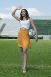 Saia corte evasê com recorte, em crepe, forrada, cós embutido, fechamento por zíper lateral.